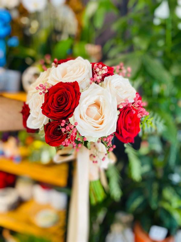 Kırmızı ve kırık beyaz güllerin kusursuz uyumuyla hazırlanan bu özel gelin buketi, aşkın tutkusunu ve saflığını aynı anda yansıtır. Yuvarlak formu ve dengeli renk geçişleriyle klasik ama zamansız bir şıklık sunar.