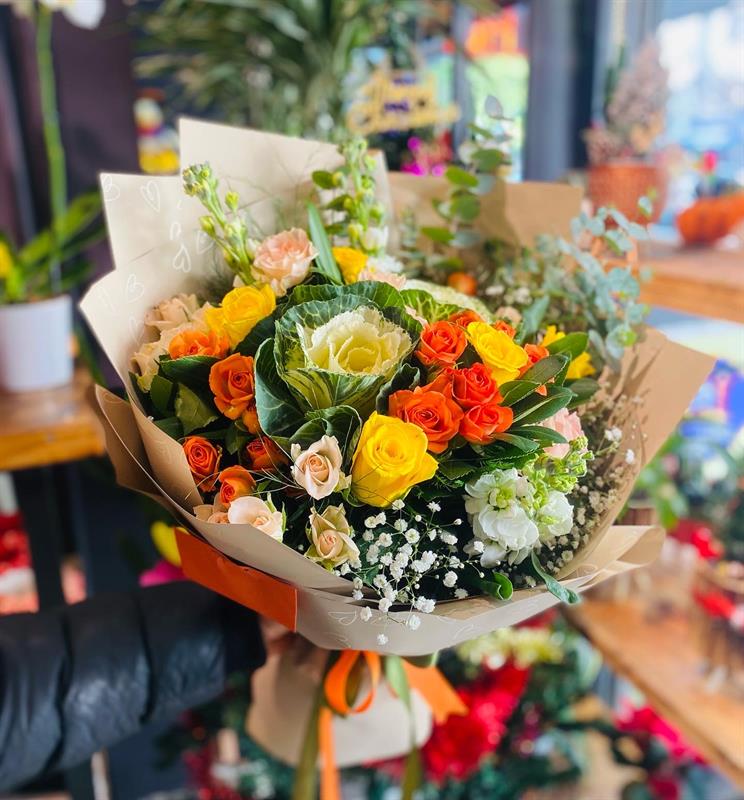 Turuncu, sarı ve somon tonlarındaki güllerin enerjik uyumu; mis kokulu şebboyların zarafetiyle buluşuyor. Canlı renkleri ve ferah tasarımıyla bu buket, sevdiklerinize mutluluk ve pozitif duygular armağan etmek için ideal bir seçimdir.