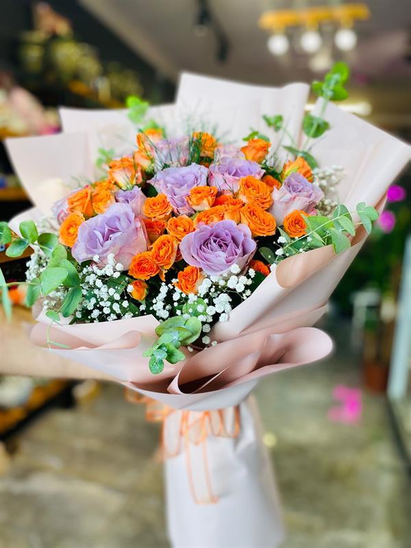 İthal güllerin canlı renkleri ve zarif dokusuyla hazırlanan bu özel buket, şıklığı ve romantizmi bir arada sunar. Turuncu ithal güllerin enerjisi, lila tonlardaki güllerin yumuşaklığıyla dengelenirken; okaliptüs ve mevsim yeşillikleri aranjmana modern bir hava katar.