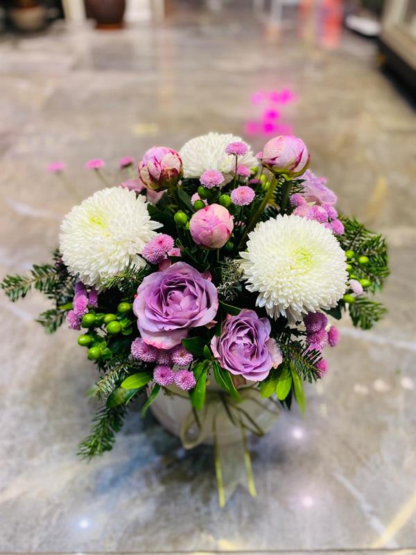 Anastasia & Lila Gül & Şakayık Aranjmanı, zarafeti ve romantik dokunuşları bir araya getiren özel bir tasarımdır. Gösterişli beyaz anastasialar, yumuşak tonlu lila güller ve pembe şakayıkların doğal uyumu sayesinde aranjman hem göz alıcı hem de sofistike bir görünüm sunar.
