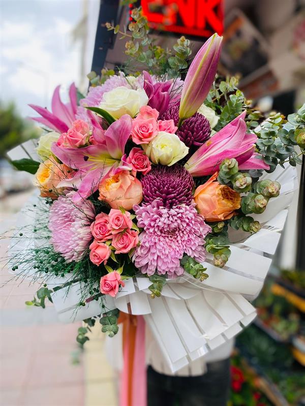 Pastel tonların zarif uyumuyla hazırlanan bu özel buket; pembe lilyumlar, anastasia, güller ve mevsim çiçeklerinin taze dokunuşunu bir araya getirir. Canlı ama yumuşak renk paletiyle hem şık hem de içten bir etki yaratır.