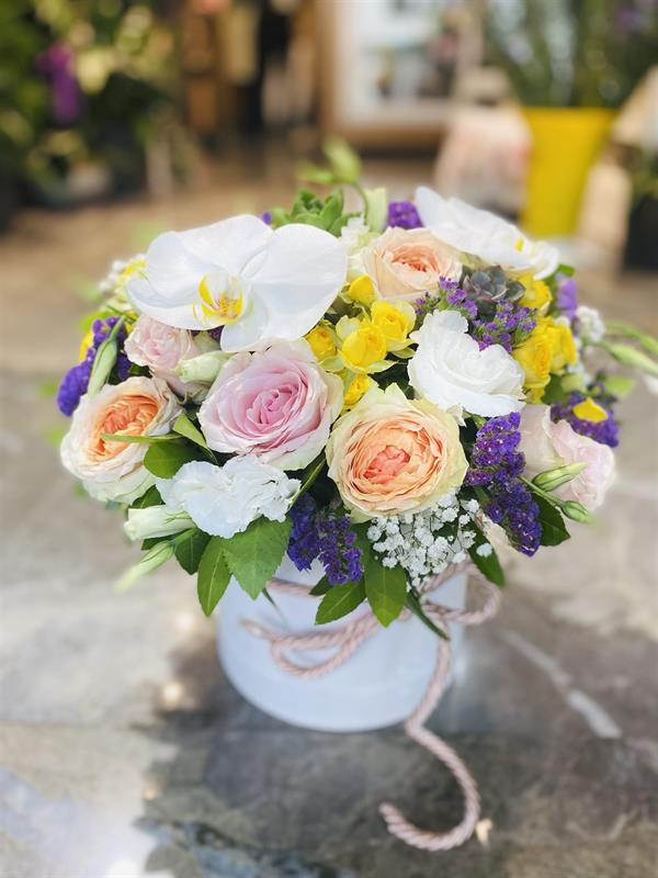 Beyaz orkidenin asil duruşu, romantik çardak gülleri ve sıcak somon güllerin uyumuyla hazırlanan bu özel kutu aranjman, zarafet ve şıklığı bir araya getirir. Mor ve sarı detaylarla zenginleştirilen tasarım, ferah ve canlı bir görünüm sunarken özel günlerde duygularınızı en zarif şekilde ifade etmenize yardımcı olur.