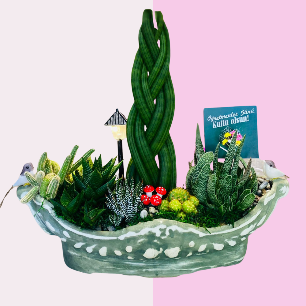 İzmir içi aynı gün teslimat sağlıyoruz. Gondol saksıda örgü sanseveria ve haworthiaların bir araya geldiği bu özel tasarım, hem minimalist hem iddialı bir görünüm sunar.